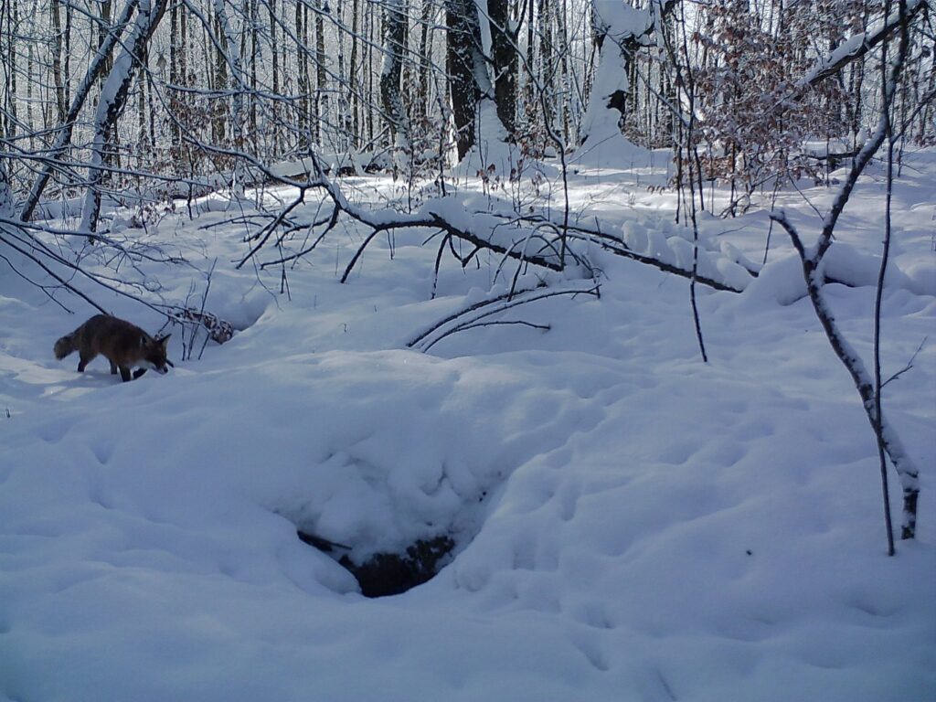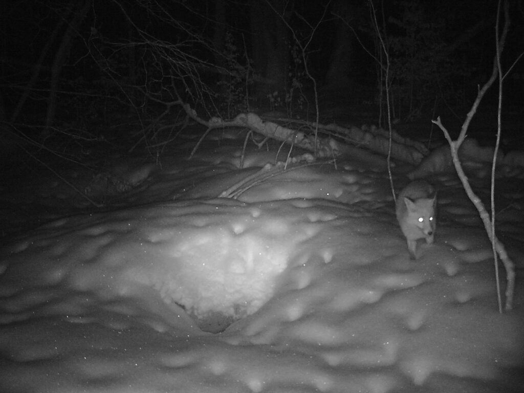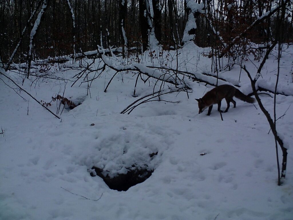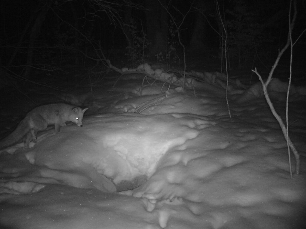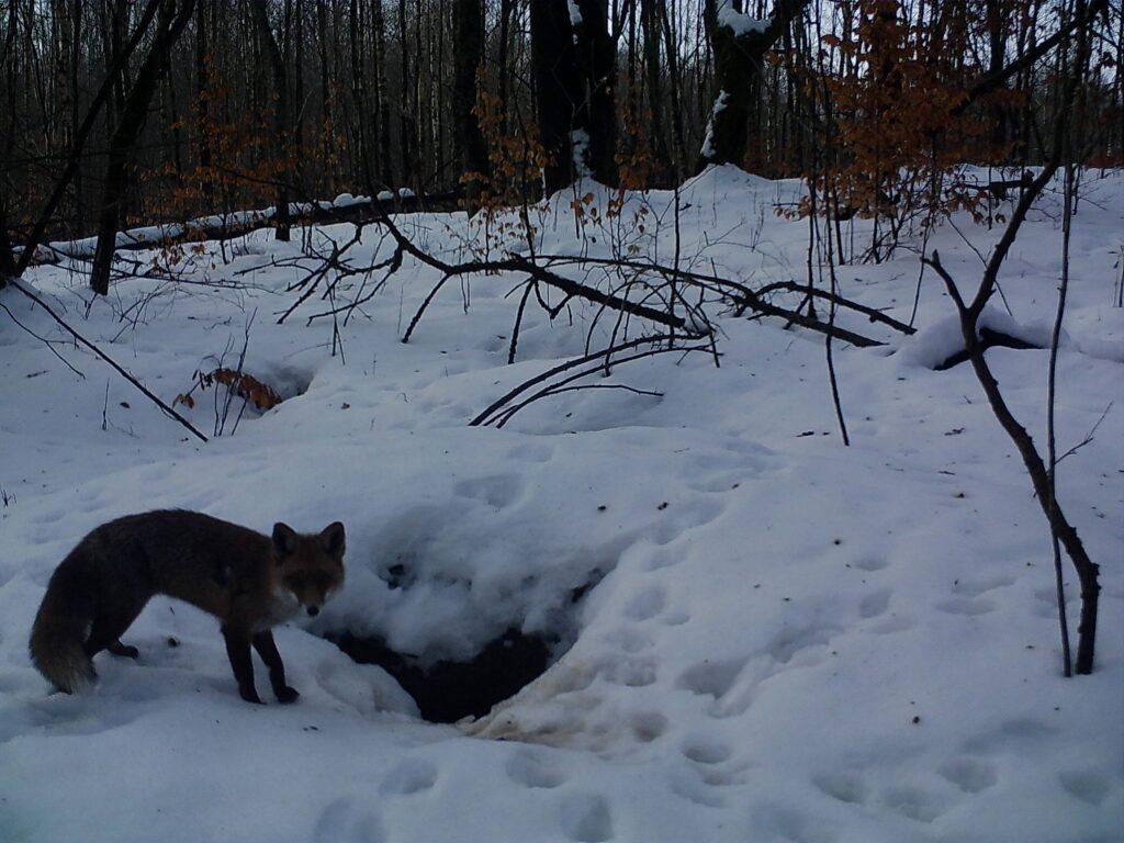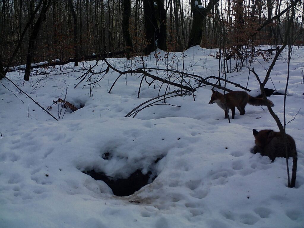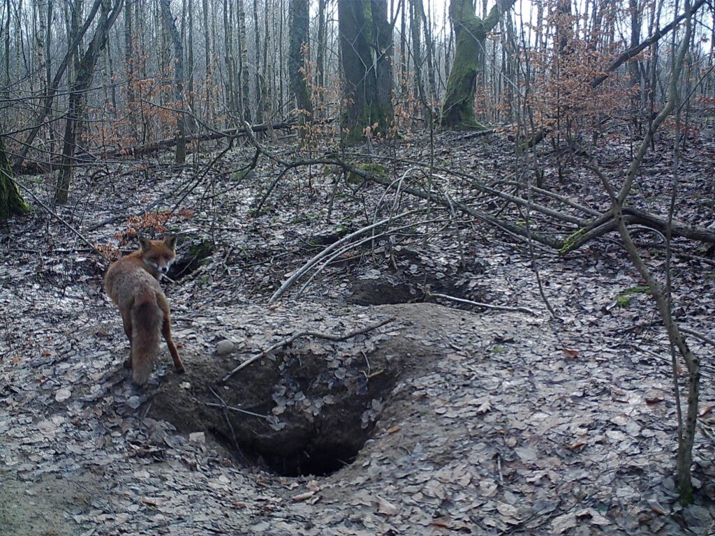 Pewnego słonecznego, zimowego dnia przyjechawszy po raz kolejny porządkować miejsce przyszłej zagrody, zobaczyliśmy rudego, zwinnego lisa. Cicho przesuwał się pomiędzy brzozami i dębami, strącając biały puch z niższych roślin. Las wokół cały podzielony był lisimi ścieżkami. Zamontowaliśmy fotopułapkę w pobliżu systemu nor, tuż za przyszłą zagrodą. Tak oto zaczęłam obserwować życie toczące się na Lisiej Górce. Lisy zimą pojawiały się głównie rano i wieczorem. Ich okres godowy, zwany cieczką, przypada na styczeń i luty, a ciąża trwa około 50 dni. Może teraz już chowają się w komorach małe, szare kuleczki?