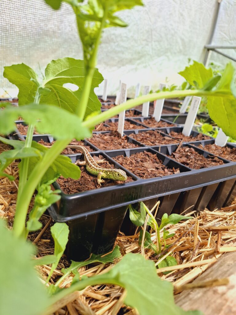 - Gady – kolejna grupa kręgowców. W odróżnieniu od płazów ich jaja mają twardą osłonkę i nie potrzebują środowiska wodnego do rozwoju. Za to uwielbiają się wygrzewać w słońcu. Do życia potrzebują jedzenia (owady, ślimaki i inne bezkręgowce) oraz kryjówek, słonecznych nagrzanych miejsc – kamieni oraz nasłonecznionych kawałków drewna. Czasem składają jaja w kompoście i często się w nim kryją!