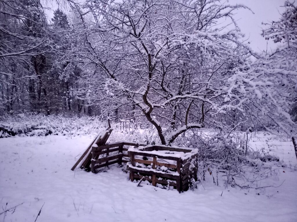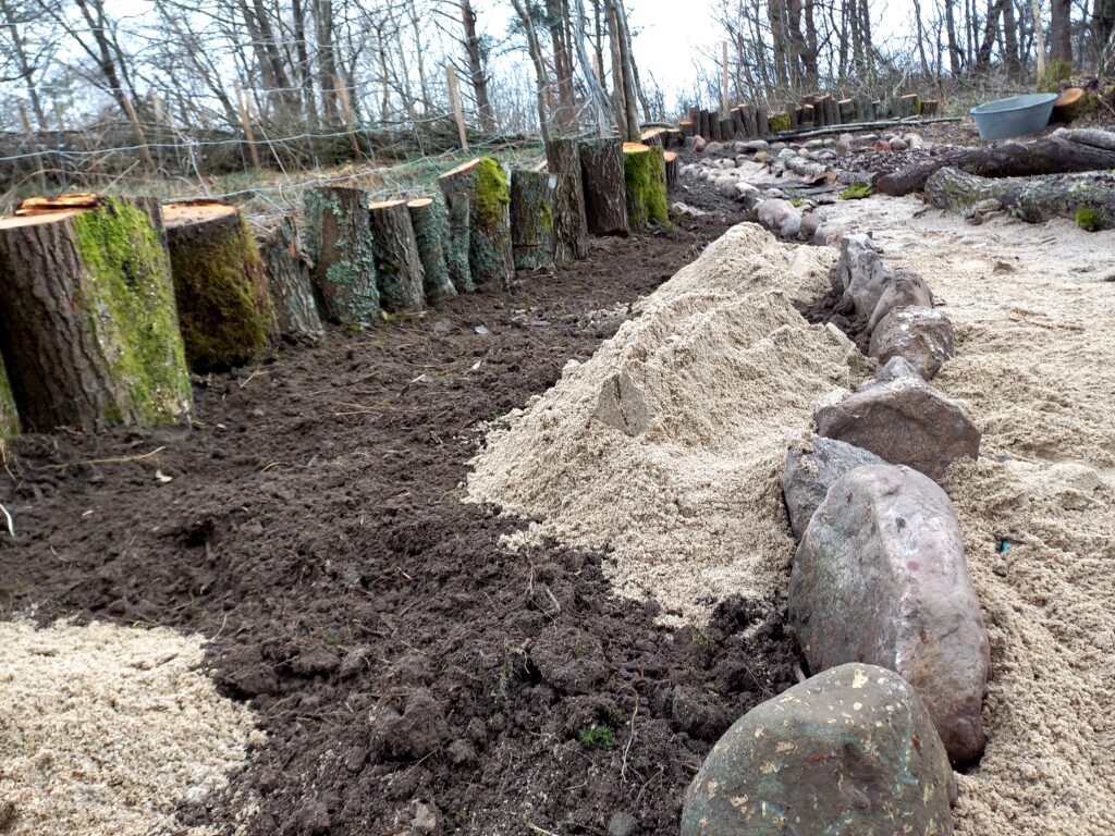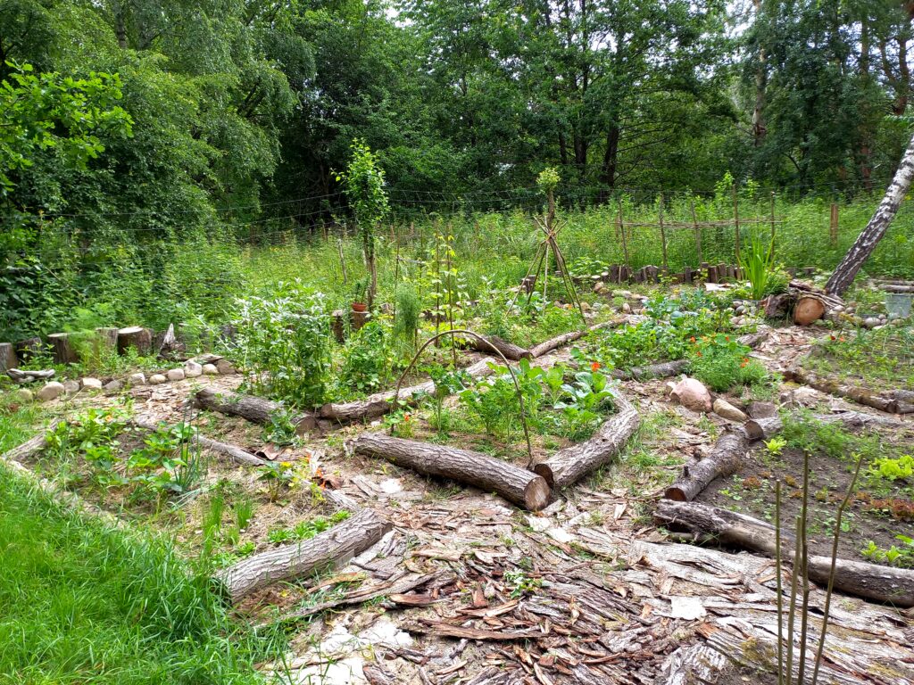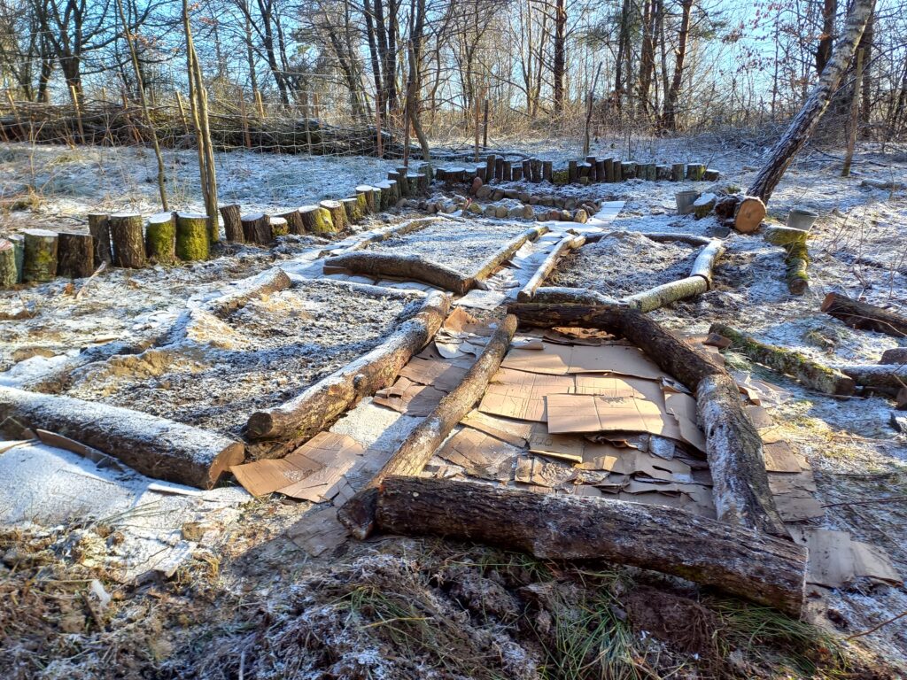 Po pierwsze, z palet skonstruowałam kompostownik, bo to on jest centrum każdego ogródka. Pozwala zmienić formę temu, co już przeminęło. Kompostownik to prawdziwe centrum bioróżnorodności i podstawa permakulturowej uprawy ziemi. Z powycinanych drzew (głównie wierzb) ułożyłam ramki podwyższonych grządek, a ich wnętrze wyłożyłam kartonami. Na tą warstwę nawiozłam taczką ziemię. Ścieżki wyłożyłam korą, a później zrębkami. Pracę w toku widać poniżej: