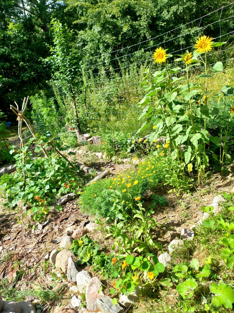 Wokół warzywnika powstało parę miejsc na rabaty kwiatowe – otoczonych polnymi kamieniami. Nasadziliśmy też z mężem kilka pierwszych krzewów i drzew owocowych. Tuż przy grządkach powstało mini oczko wodne ze starej ocynkowanej balii – przez cały sezon przebywały w nim żaby brunatne, a ptaki chętnie piją z niego wodę.