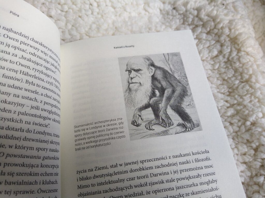 Pióra pojawiły się już u teropodów, ich ewolucja sięga mezozoiku. Pierwszy na to dowód w postaci skamieniałości szkieletu Archeopteryxa (Archaeopteryx litographica) znaleziono w Niemczech, w 1861 roku (dwa lata po opublikowani przez Karola Darwina „O powstawaniu gatunków”). Skamieniałością tą pewien kamieniarz zapłacił za wizytę lekarską u Karla Häberleina. Ten, sprzedał okaz Robertowi Owenowi – dyrektorowi działu historii naturalnej British Royal Museum. Wydarzenia te, kolejne znajdywane skamieniałości oraz nastroje panujące w ówczesnym świecie nauki sprzyjały dyskusji o ewolucji, która rozgorzała na dobre. Co ciekawe, nabywca wspomnianego okazu stał po tej stronie sporu, która teorii ewolucji przeczyła! Te historyczne przekazy i dyskusje w „Piórach” , według mnie, opisane są porywająco, niczym fragment książki przygodowej.