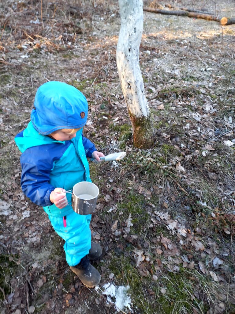 5. Bielenie drzew. Ogrodowy strzał w dziesiątkę: po pojemniku i pędzlu, ja jedno drzewo, dwulatek drugie. Na raz nie pomalujemy wszystkich, ale atrakcja warta zachodu. Bielimy pnie drzew, czasem krzewów wapnem zmieszanym wodą (powinniśmy uzyskać konsystencję śmietany) lub specjalną farbą. Zadaniem bieli jest odbijanie promieni słonecznych. Zimą chroni to przed ranami zgorzelinowymi, powstającymi na skutek pobudzenia komórek korowych do aktywności przez słońce nagrzewające korę. Wybudzone komórki stają się wrażliwe na przemarzanie, a przemarznięte obumierają – powstają rany i pęknięcia. Wiosną bielenie opóźnia sezon wegetacyjny, co chroni przed przymrozkami kwiaty i pąki. Rozwijając się później są mniej narażone na przemarznięcie podczas wiosennych przymrozków.
