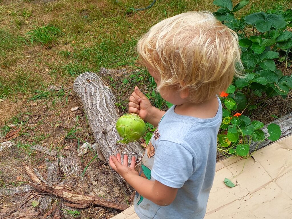- Dzieci rozwijają wszystkie zmysły: uczą się nowych smaków, subtelnych różnic kolorów między już dojrzałymi, a jeszcze nie-do-końca-dojrzałymi owocami, dotykają różnych faktur i kształtów (twarda marchewka, miękka truskawka, gładka cukinia, szorstki ogórek, słuchają ptaków, trzmieli i szumu roślin oraz wąchają warzywa i zioła. Jeśli mamy w ogrodzie kąt z ziołami, niech maluch wybierze z czego chciałby wypić napar. Ostatnio synek namówił mnie na herbatkę ziołową wołając „Mama, mama, ja wywącham co chce wypić” i wywąchał. 😀
