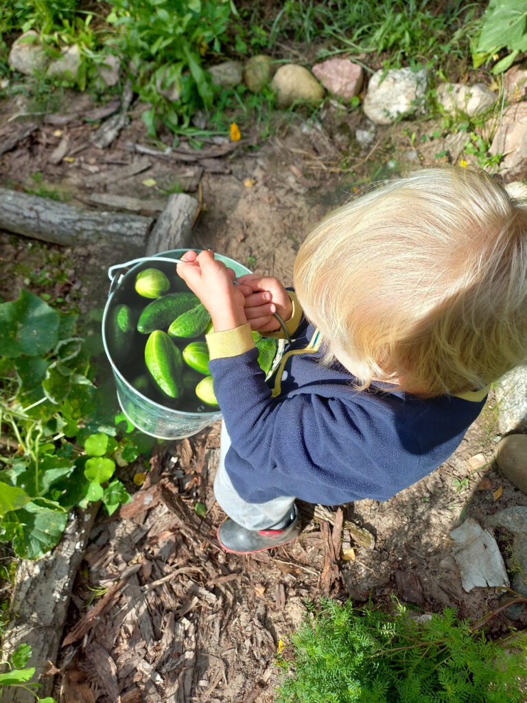 6. Zbieranie plonów. Obojętnie, czy do buzi, czy do pojemnika, czy prosto na stół, zbierajmy plony z dziećmi.